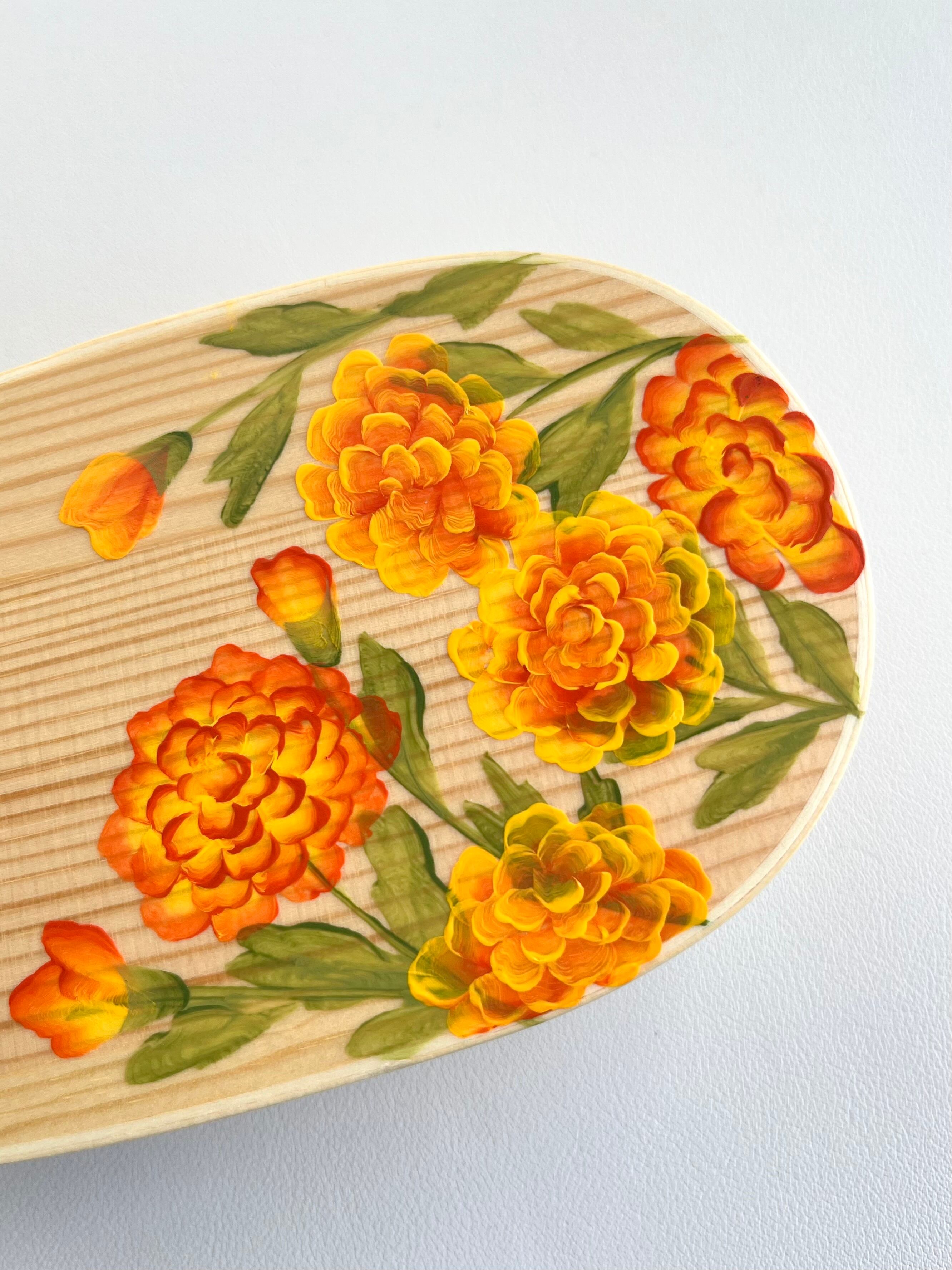 自然の優しさを感じるマリーゴールド柄の「曲げわっぱお弁当箱」です。